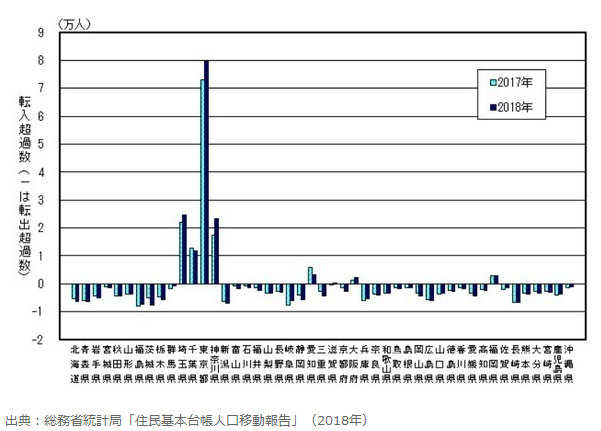 目前,超級大城市日本東京人口集中的勢頭正強勁。 根據(jù)2018年總務省統(tǒng)計局“居民基本臺帳人口移動報告”,東京都的凈流入人數(shù)(從流入人中減去流出人數(shù))為7萬9,844人。 與前年相比增加了6,720人,大大突出了其他都道府縣。 值得一提的是,東京都連續(xù)23年均超額轉(zhuǎn)入。