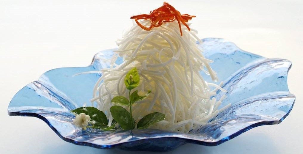 蔥白:切蔥足以見刀工。先在蔥白段上縱向淺淺地劃一刀,掰開取出蔥芯白。將外側的蔥白切成4厘米見長的蔥絲,這在日本叫做“白發蔥絲”。切好的蔥絲浸在水里待用。把取出來的蔥芯白斜向切成薄片。