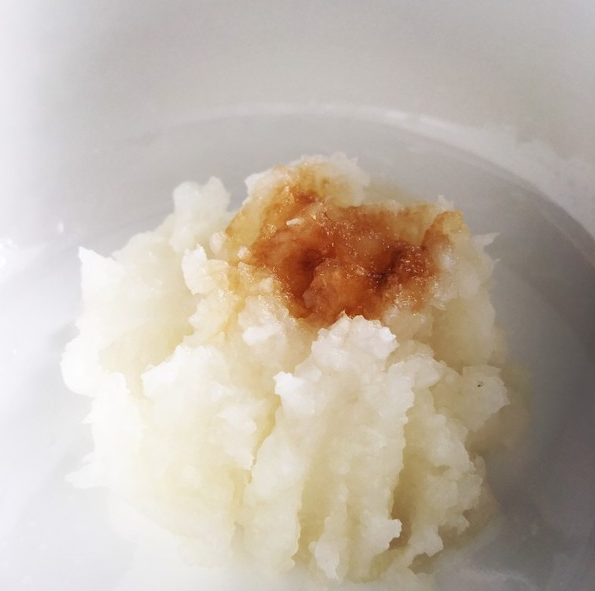蘿卜:日本料理最常見的澆頭--蘿卜泥。白蘿卜去皮后縱向切成兩半,用擦泥器擦成泥。注意要把蘿卜的橫切面放在擦泥器上,以便切斷蘿卜的纖維。