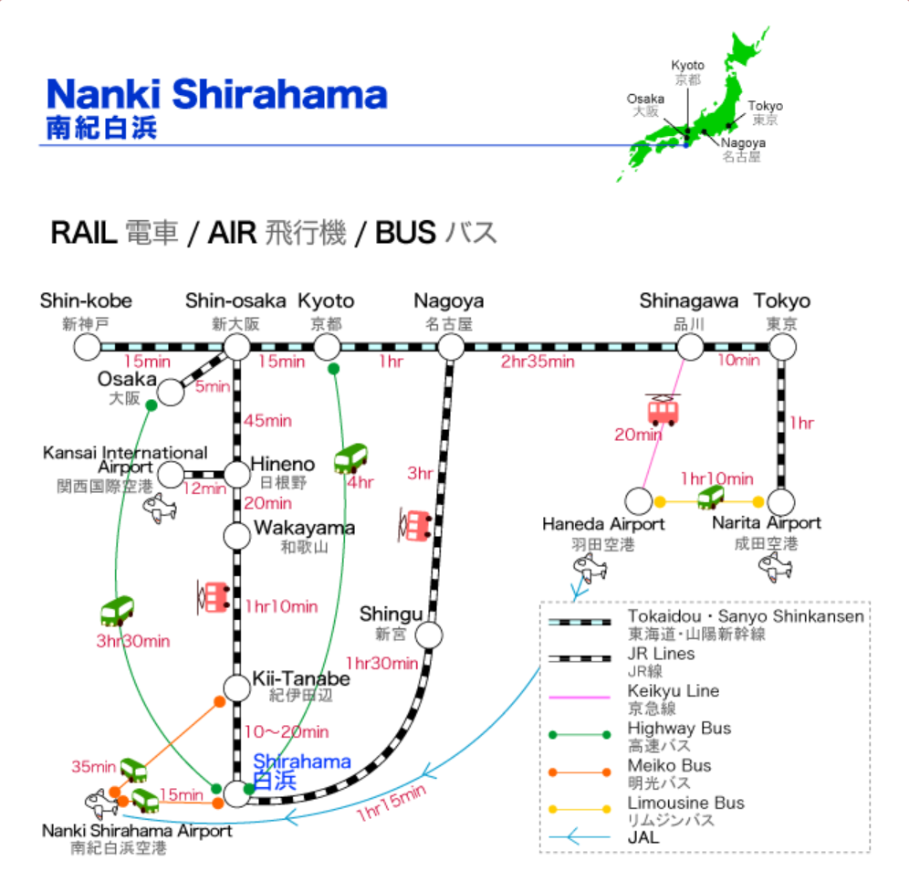 在白濱町,各種交通方式齊全,出行非常便利。不但有直達大阪機場的電鐵,白濱町還有自己的機場,直飛東京也不過一個多小時。