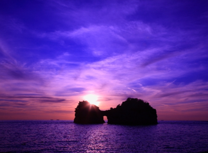 南紀白濱三面環海,綿延640米的平淺海濱。含有90%硅酸的石英砂白凈而松散。如同被鑲嵌于這邊蔚藍大海之中閃耀的鉆石。著名景點圓月島、千疊敷、三段壁的絕美景致無不是大自然的饋贈,游歷其中,是人與自然完美融合的畫面,心靈凈化的歷程。