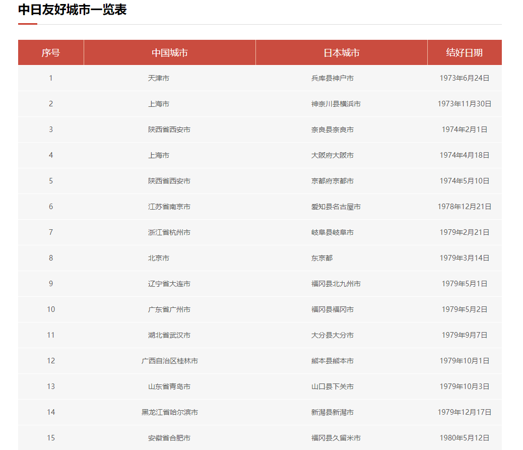 “友好城市在世界上又被稱為姐妹城市(Twin Cities),主要興起于二戰之后的歐洲。它指一國的城市(或省州、郡縣)與另一國相對應的城市(或省州、郡縣),以維護世界和平、增進相互友誼、促進共同發展為目的。在簽署正式友城協議書后,雙方城市將積極開展政治、經濟、科技、教育、文化、衛生、體育、環境保護和青少年交流等各個領域的交流合作,這種正式、綜合、長期的友好關系或制度安排,就是友好城市關系。我國在國際友好城市活動中,起步相對較晚,1973年,在周恩來總理的親自關心和支持下,天津市與日本神戶建立了中國第一對國際友好城市。”而到了現在,通過中日友好協會的官網上可以看到,中日兩國互為友好城市的數量多達256對。