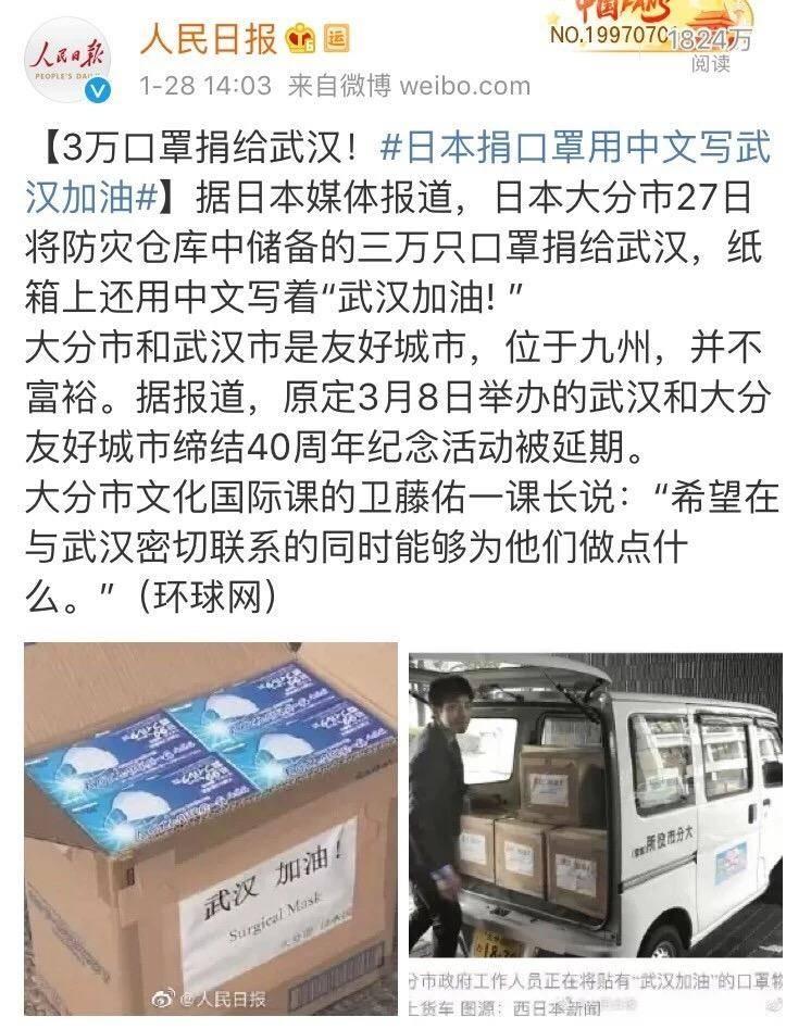 對于此次新型冠狀病毒肺炎疫情,日本的大分市與武漢市是友好城市。疫情發生后,大分市在第一時間就緊急捐贈了3萬個口罩。之后又募集了第二批物資并送達武漢市,包括400套防護服,400個護目鏡。大分市政府還呼吁市民一起幫助武漢,開展了募捐活動。