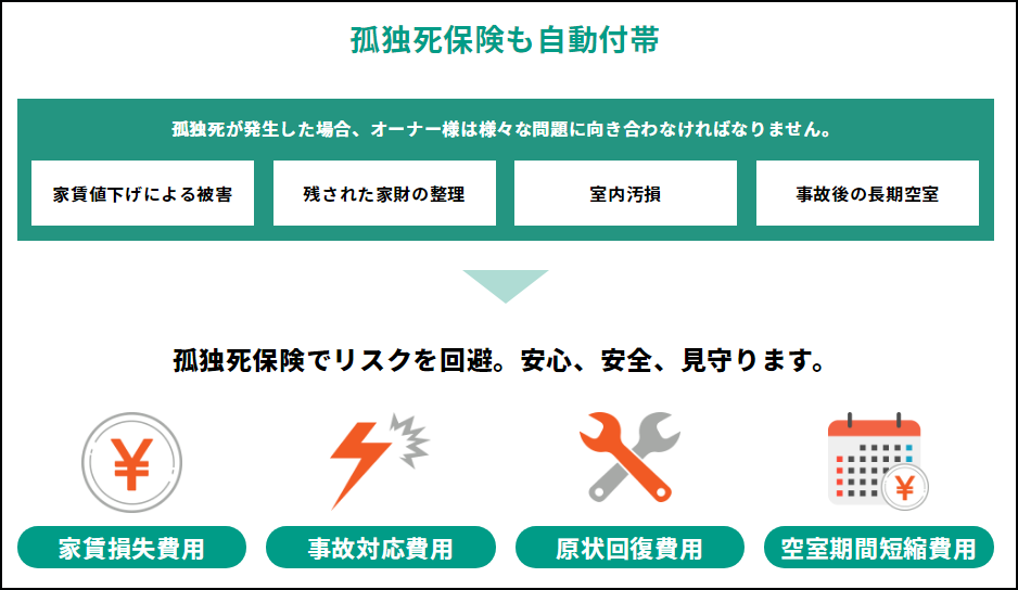 隨著日本老齡化進程的不斷加重,獨居老人的孤獨死已經成為了越來越普遍的社會問題,有很多老人甚至是在死去很長時間后才會被發現。對于將房子租給這些老人的房東來說,清理尸體、清理房間現場、重新裝修房間、處理后續問題等,就需要花一大筆錢,同時這樣的房間恐怕會在很長一段時間都無法出租出去,這對房東來說,就是巨大的損失了。于是一種自帶“孤獨死保險”及擔保功能的房屋管理公司便出現了,將給予房東充足的利益保護。