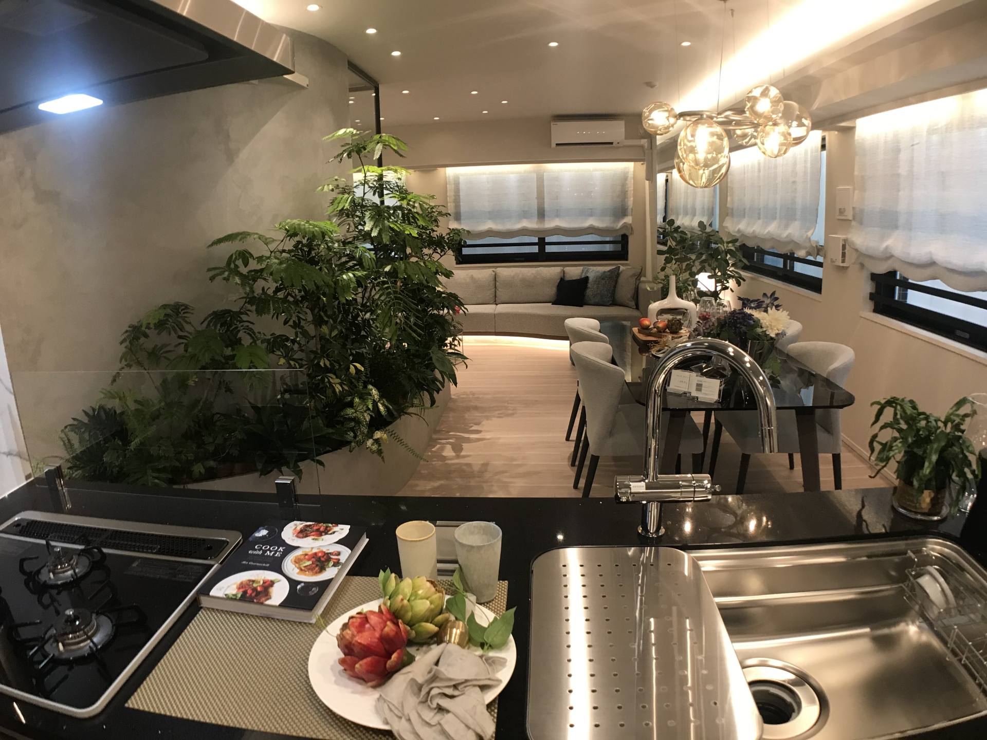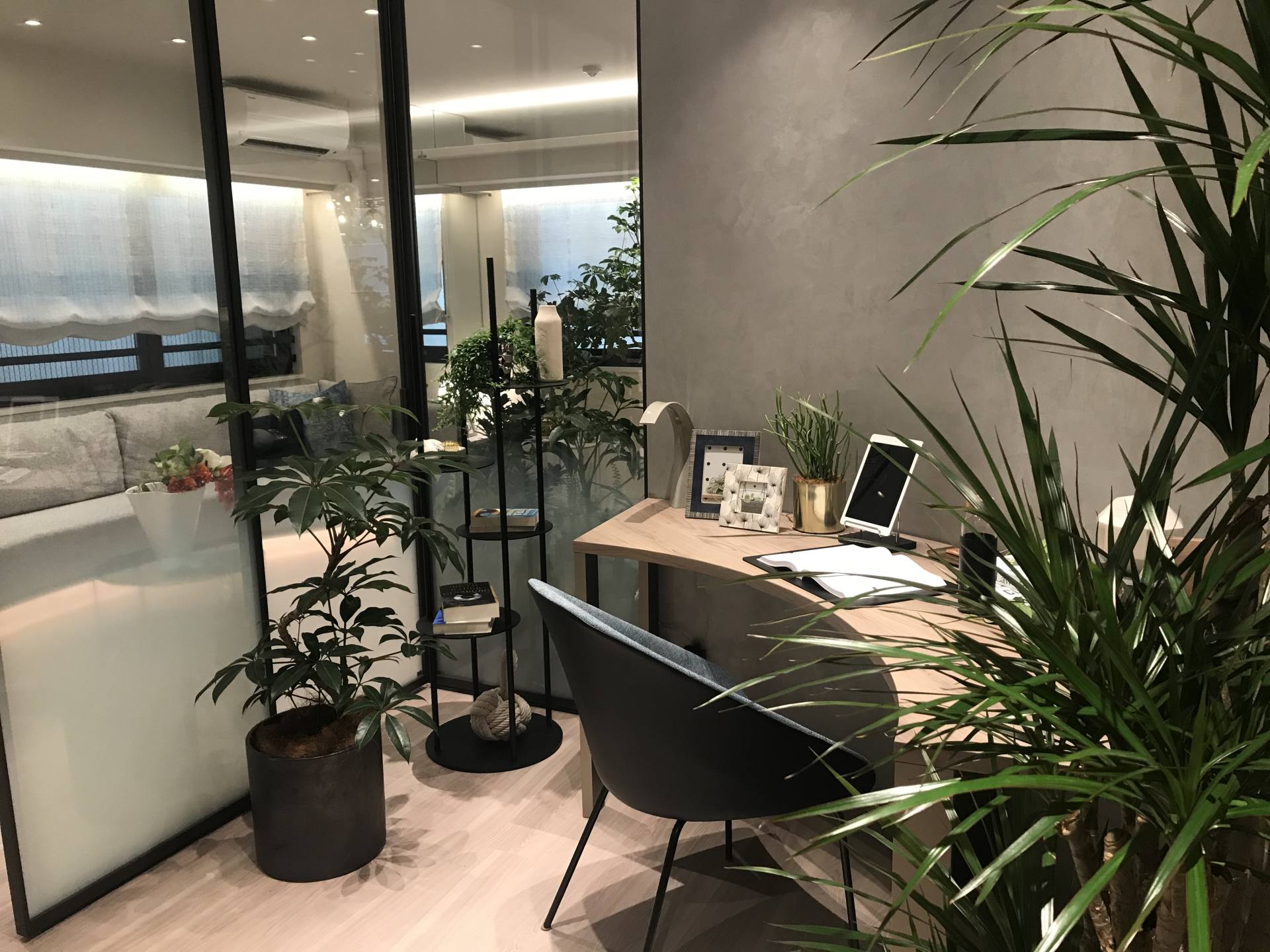 日本的設(shè)計(jì)師非常擅長(zhǎng)放大面積的空間感,70平方米左右的面積看起來(lái)更像豪宅的寬敞明亮。特別是新冠肺炎疫情席卷全球以來(lái),在家辦公成為生活的主要模式,家里不單是休息的地方,更是承擔(dān)了日常辦公的功能。拆掉書房的隔斷墻,以落地玻璃隔斷取而代之,并一反常態(tài)地將直角墻改為弧形,空間更顯靈動(dòng),私人辦公室的時(shí)尚感立馬呈現(xiàn)出來(lái)。而且玻璃隔斷墻也打破了以往“一隔到窗”的設(shè)計(jì),而是根據(jù)功能和需求協(xié)調(diào)空間,增加了客廳的面積。在視覺效果上,玻璃書房更顯通透,視覺空間寬敞。延伸的客廳也顯得寬敞大氣,即使同事一起開會(huì)都不成問(wèn)題。書房采取了“雙門”設(shè)計(jì),可以根據(jù)需要隨時(shí)切換“公、私”的空間,兩個(gè)門都打開時(shí)書房便成了背景墻,室內(nèi)空間更顯得寬敞通透,使用更方便。而使用玻璃隔斷墻特意打造出來(lái)的綠植空間,再配合玻璃隔斷,儼然打造出了充滿氧氣的植物園,再配合廚房、臥室、陽(yáng)臺(tái)等擺放的綠植,相互呼應(yīng),讓人感嘆生活的在自然中的美好。