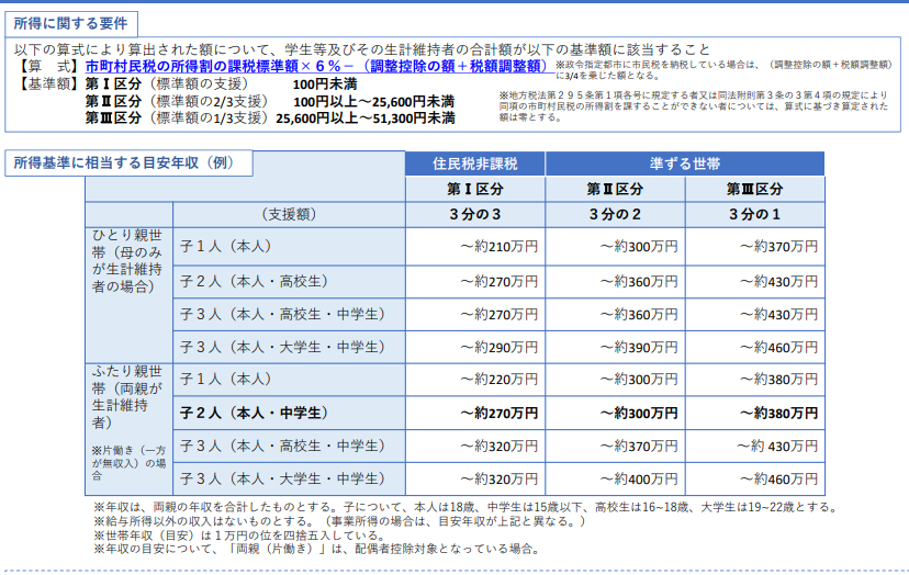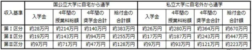 低收入家庭的孩子將受益于這一政策。根據家庭收入及資產的不同,該制度將學生分為三個等級,學費等減免額和支付獎學金的支付額會隨著家庭年收入的增加而減少,分類ⅰ的學生可以獲得滿額支付,而分類ⅱ的學生可以得到滿額的三分之二的支援,分類ⅲ的學生可以得到滿額的三分之一的支援。