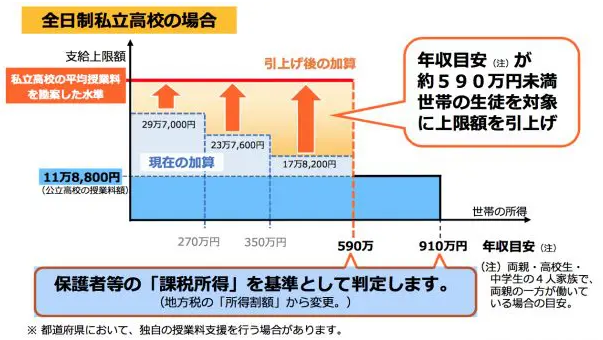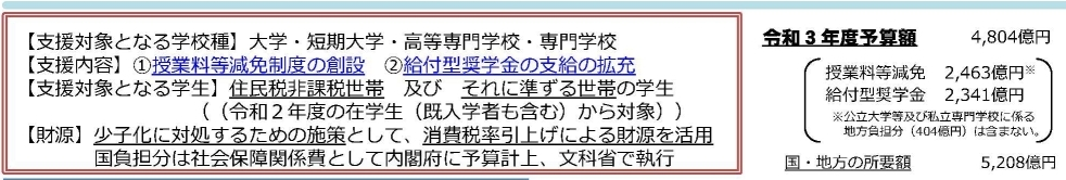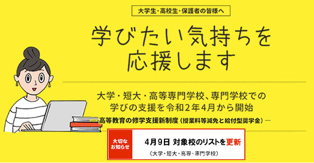 與此同時,日本的大學免費政策不僅是面向公立高校,還包括私立高校。全日制高等學校的年平均學費(平成30年),公立高等學校約12萬日元,私立高等學校約40萬日元。在高等學校,除了學費以外,修學旅行費、遠足見學費、PTA會費、學習用品費、交通學費等學校教育費也是相當昂貴的。為了讓就讀私立高校的學生也能安心學習,學費的減免及補貼支援獎學金等也包含在大學免費教育這一國策里,符合標準的學生均可申請。