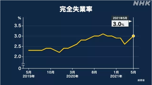 在今年3月,即緊急事態(tài)宣言解除后進(jìn)行的調(diào)查中,日本的完全失業(yè)率曾跌至2.6%,之后又連續(xù)兩個(gè)月出現(xiàn)了增長(zhǎng)。根據(jù)日本總務(wù)省公布的數(shù)據(jù)顯示,截至5月,日本國(guó)內(nèi)的完全失業(yè)人數(shù)為211萬人,日本全國(guó)完全失業(yè)率時(shí)隔4個(gè)月達(dá)到了3.0%,環(huán)比上升了0.2個(gè)百分點(diǎn)。(美國(guó)勞工部公布的數(shù)據(jù),2021年05月美國(guó)失業(yè)率為5.8%。中國(guó)國(guó)家統(tǒng)計(jì)局公布的數(shù)據(jù),2020年12月份,中國(guó)31個(gè)大城市城鎮(zhèn)調(diào)查失業(yè)率為5.1%。)