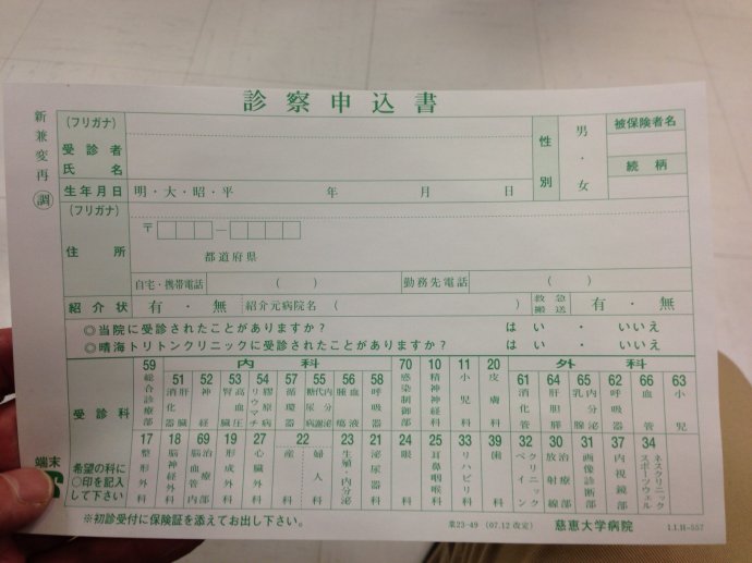 因為這是山爸第一次在日本醫院就醫,需要先填寫一張醫院的個人信息情況表,基本上就是類似姓名、住址之類的常規信息,在翻譯軟件和工作人員的幫助下,表格很快被中文和英文混搭著填滿。隨后山爸又在工作人員的引導下“掛號”,然后在公共區等待就醫。