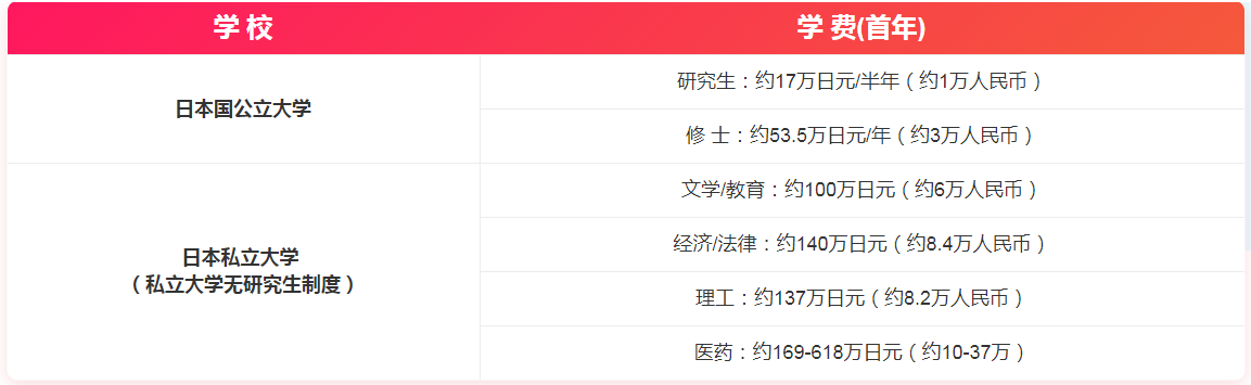 日本的留學學費與歐美國家比相對便宜,而且國公立大學比私立大學的學費相對便宜。如果申請日本國公立大學研究生時期的學費,約為每半年1萬人民幣,正常的碩士課程,每年約3萬人民幣;如果申請日本私立大學一般沒有研究生制度,正常的碩士課程,文科教育類,每年約6萬人民幣,經濟法律類,每年約8萬人民幣;理工科每年約8萬人民幣,醫(yī)藥科每年約10到37萬人民幣不等。