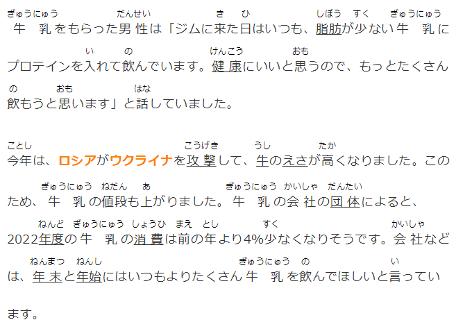 今年は、ロシアがウクライナを攻撃して、牛のえさが高くなりました。このため、牛乳の値段も上がりました。牛乳の會社の団體によると、2022年度の牛乳の消費は前の年より4%少なくなりそうです。會社などは、年末と年始にはいつもよりたくさん牛乳を飲んでほしいと言っています。