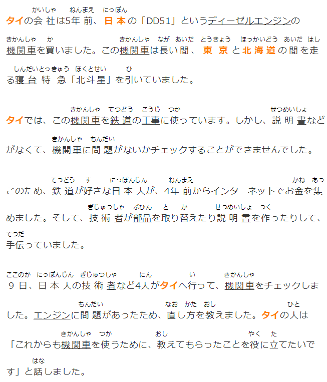 9日、日本人の技術者など4人がタイへ行って、機関車をチェックしました。エンジンに問題があったため、直し方を教えました。タイの人は「これからも機関車を使うために、教えてもらったことを役に立てたいです」と話しました。